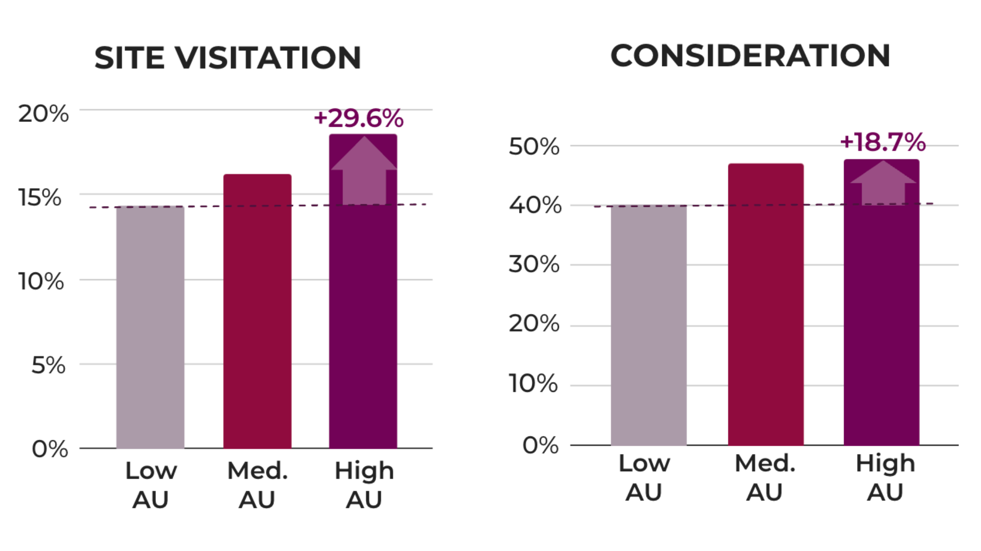 The study also found that shows with high AU scores delivered 30% higher site visitation than lower scoring AU shows, and saw brand lift across several metrics including 19% higher consideration.