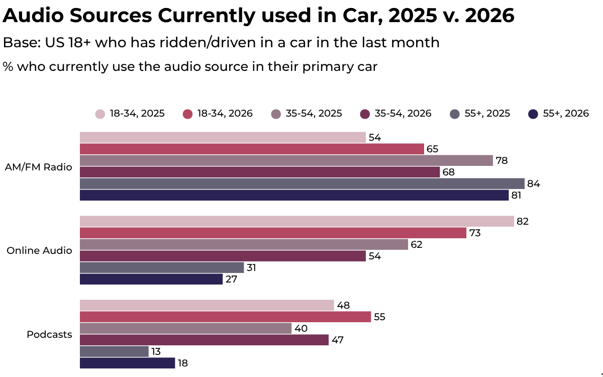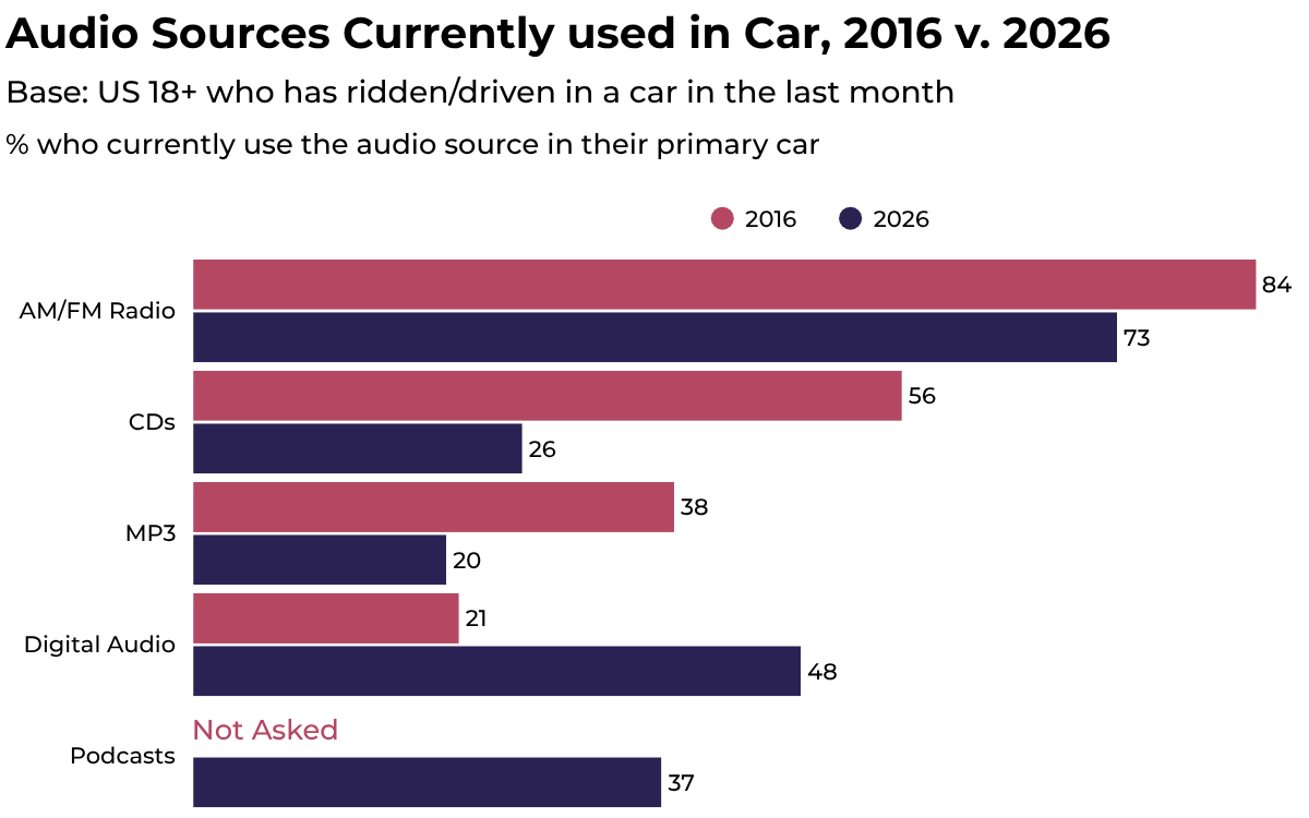 Radio continues to be the dominant in-car media, significantly outpacing digital audio and podcasts, despite the growth of those formats over the last decade. While online audio use in cars has seen substantial growth over the past ten years, it recently experienced a 7% decline, falling to 48% from 55% in 2025. Conversely, podcast listening in the car increased by 6%, suggesting a growing consumer preference for spoken-word content in this environment.