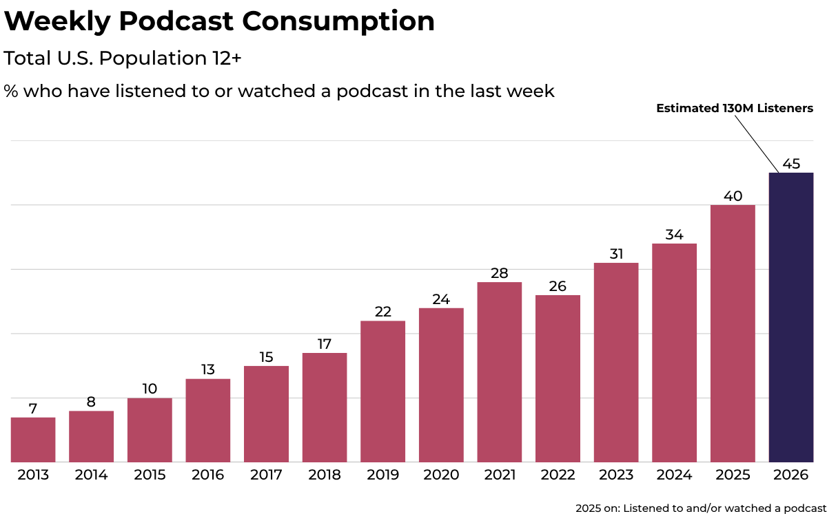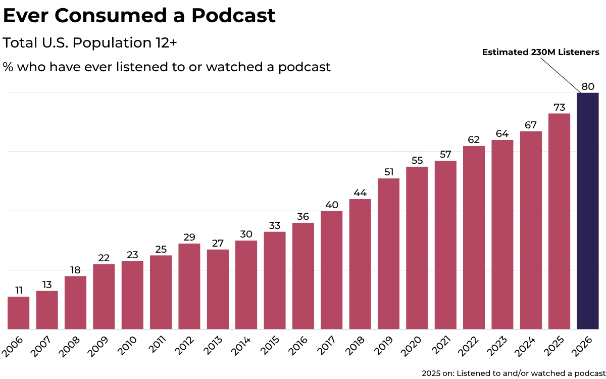 The number of Americans having ever consumed a podcast has grown by 20 million users in the past year alone, a 7% point increase and the largest jump ever recorded by the Infinite Dial since it began measuring podcast listening in 2006.