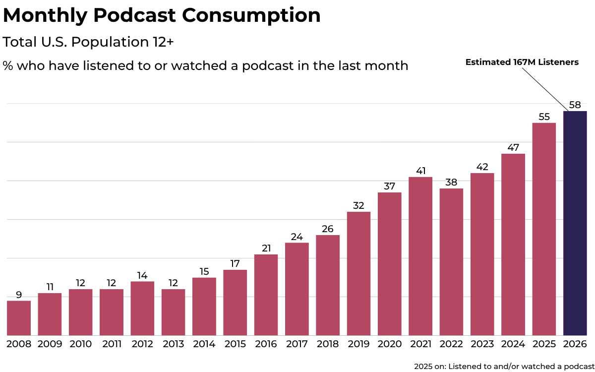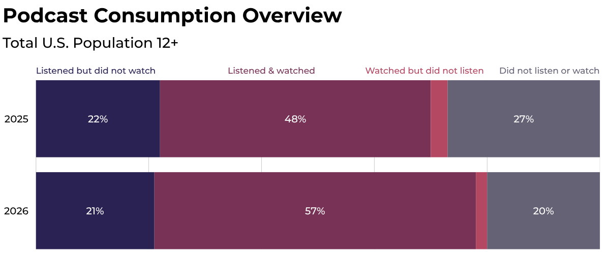 Along with continued increases among the 55+ audience, expansion into video is fueling industry growth. In 2025, The Infinite Dial began measuring both listening and watching as part of podcast consumption. Since then, the percentage of Americans who report listening to and watching podcasts has increased significantly, rising 9% from 48% to 57% in the past year. Audiences who only listen or only watch remain smaller, stable segments, while the share of Americans who have never listened to or watched a podcast has dropped from 27% in 2025 to 20%.