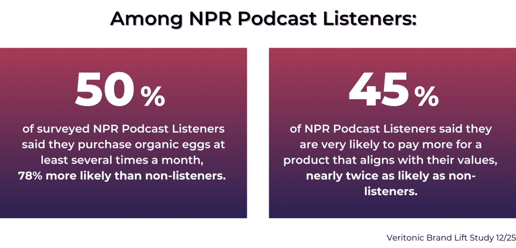Pete & Gerry’s Organic Eggs worked with NPM Creative to develop immersive audio messaging that resonated with NPR listeners as trustworthy and distinct from traditional advertising. Leveraging the NPR audience’s strong alignment with their target demographic of health and environmentally conscious consumers, the campaign effectively reached listeners where they already tune in. The immersive audio highlighted the advantages of Pete & Gerry’s Organic Pasture Raised eggs, bringing the farm experience directly to listeners while capitalizing on NPR’s established halo effect.