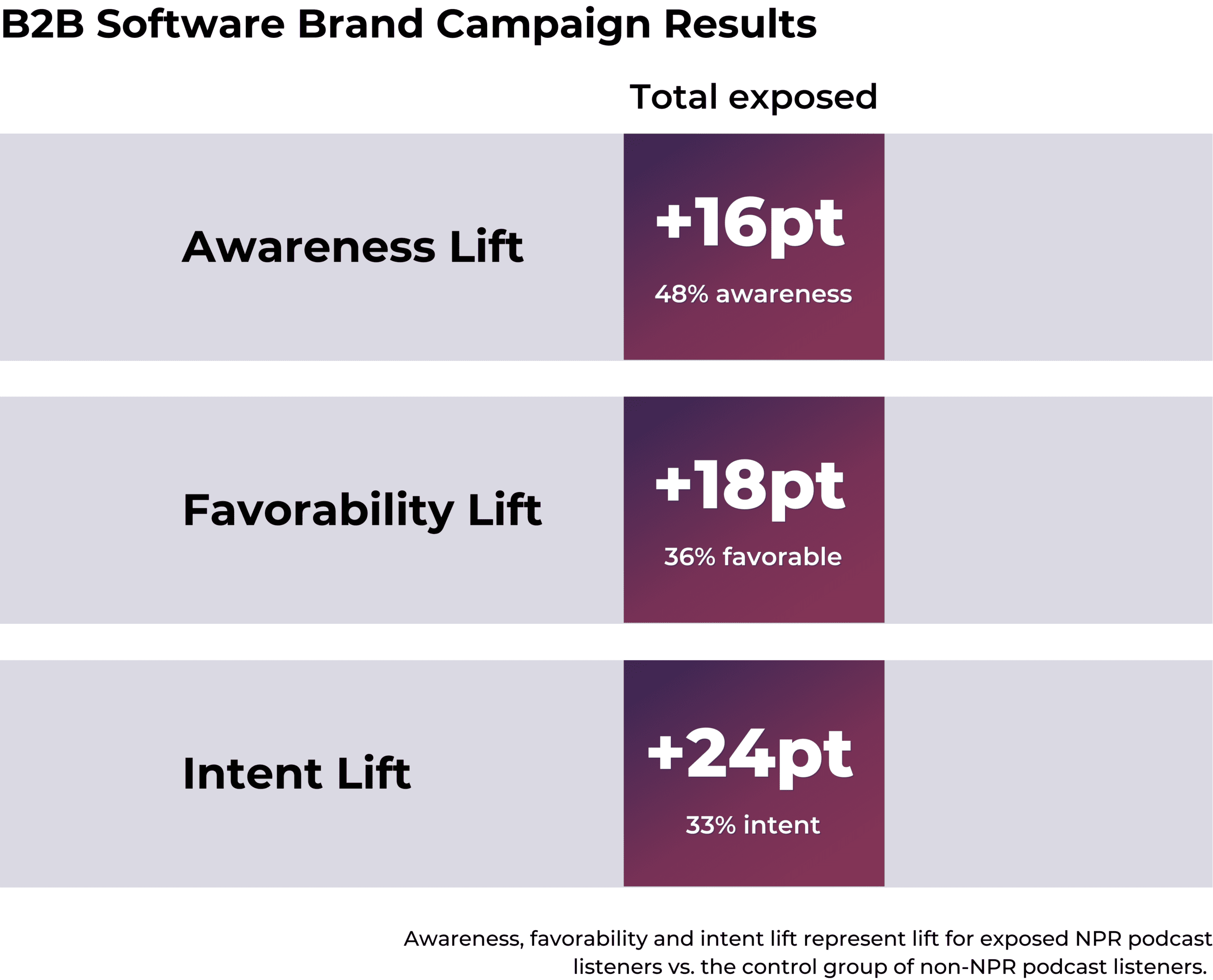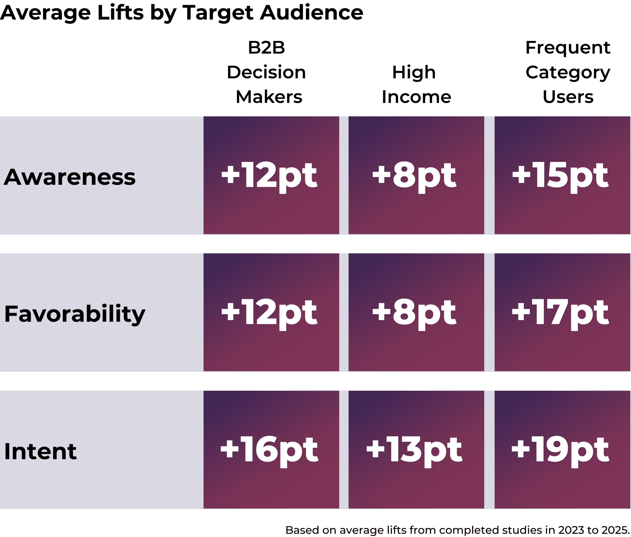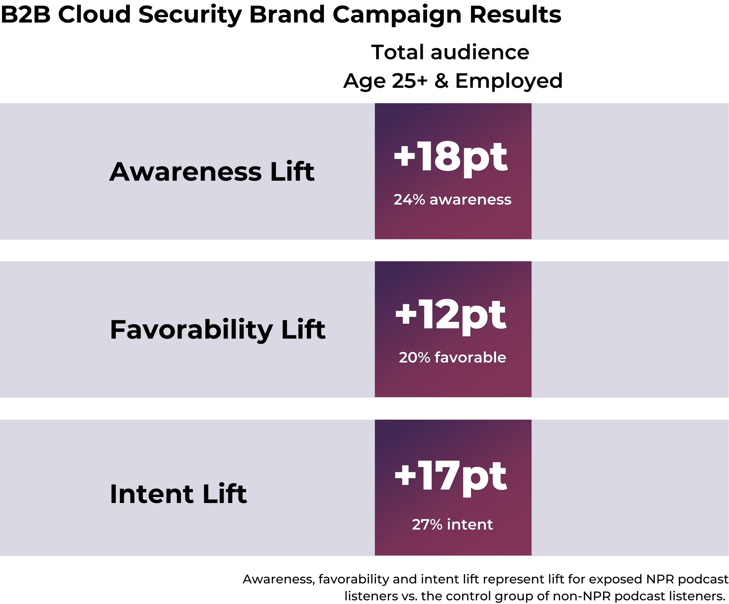 A cloud security brand achieved an awareness lift more than double the control, and an established B2B software company recorded the largest intent-to-purchase lift across all 2025 Veritonic studies.