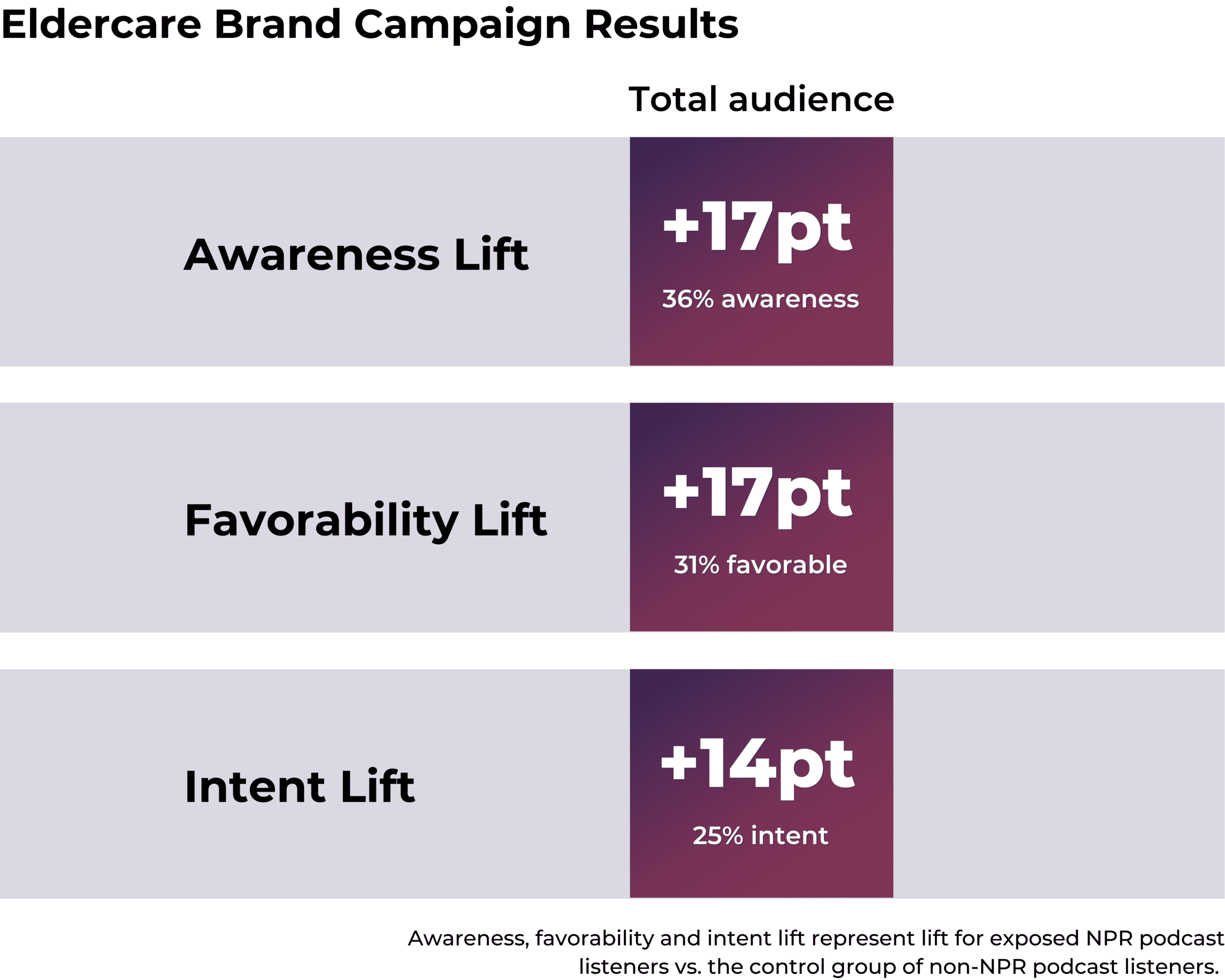 Utilizing audience targeting maximized impact for brands in 2025. Veritonic studies showed an increased lift in both intent and consideration across all target audiences, with especially strong results among business-to-business (B2B) decision-makers, high-income listeners, and frequent category users. In particular, frequent category users proved to be a crucial audience for brands aiming to capture greater market share among NPR Podcast listeners.