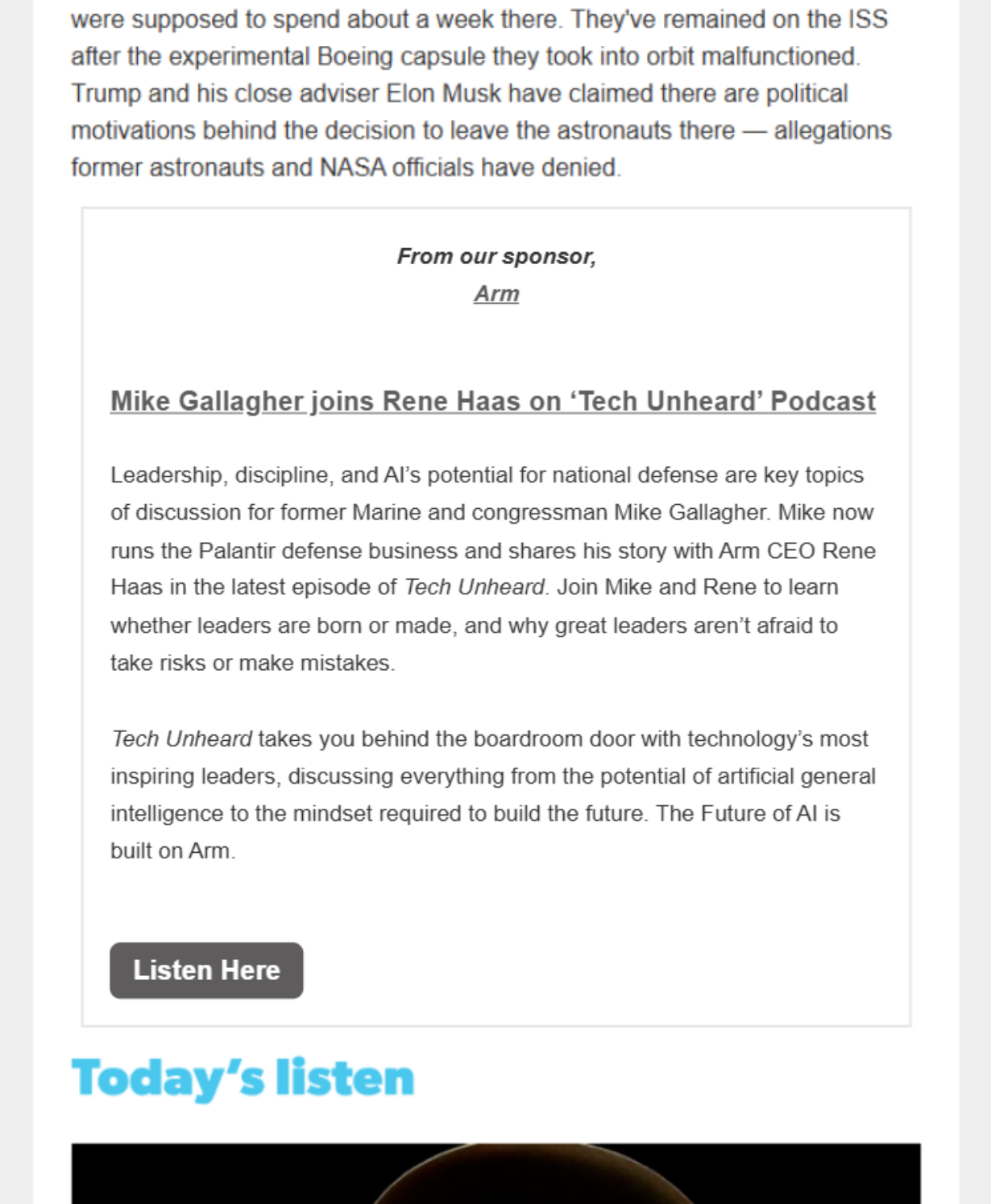 With NPR’s native newsletter sponsorship, brands with a custom audio campaign can extend their messaging to reach 1.2M of Up First’s most engaged users. Sponsorship includes a text placement based on an existing custom audio campaign that runs in the Up First daily newsletter and directs users to their custom landing page or sponsor site.