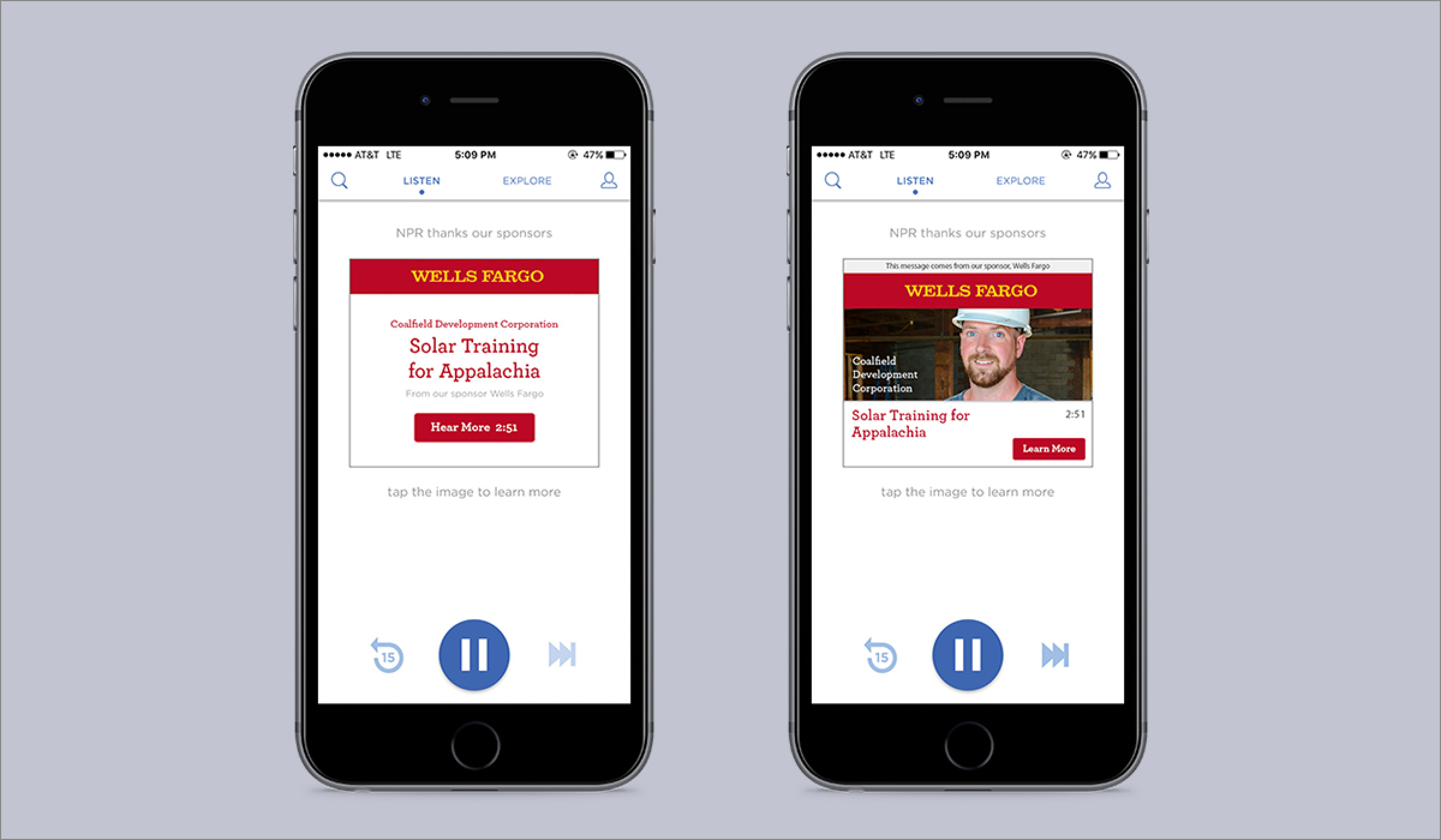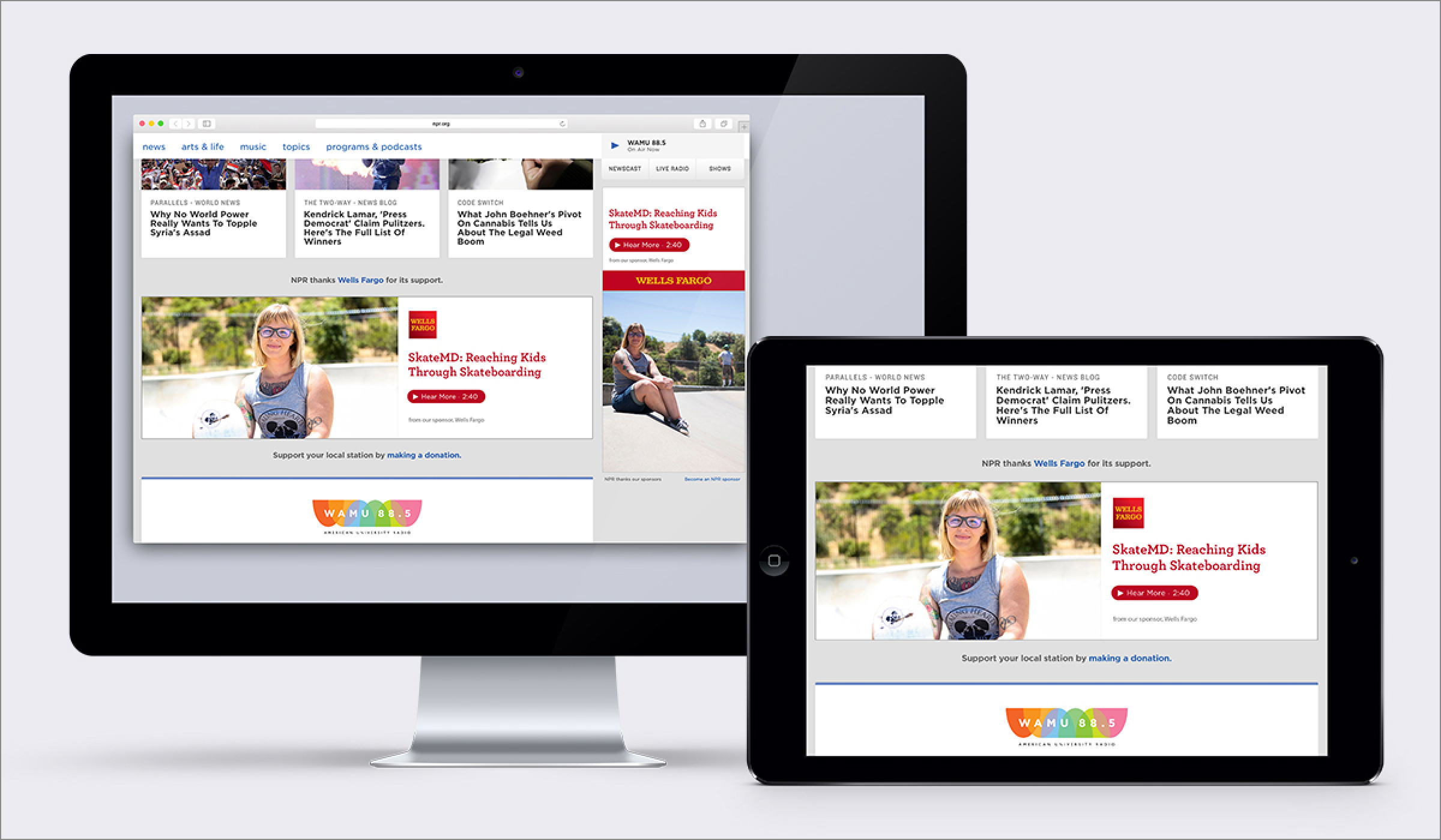In a series of three Brand Soundscapes, Wells Fargo’s non-profit partners and staff share stories from their work on the ground and about how the company’s support has helped them achieve their goals. NPR listeners heard from United Way, which partners with Wells Fargo to improve financial literacy in underserved communities; SkateMD, which provides skateboarding clinics to children with special needs; and Coalfield Development Corporation, which strengthens Appalachian economies by retraining local industry workers in green energy sectors.